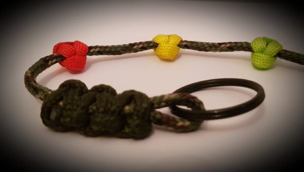 Made from 3mm military green paracord and over wrapped at both ends with 3mm camo paracord to secure two 30mm black split rings.